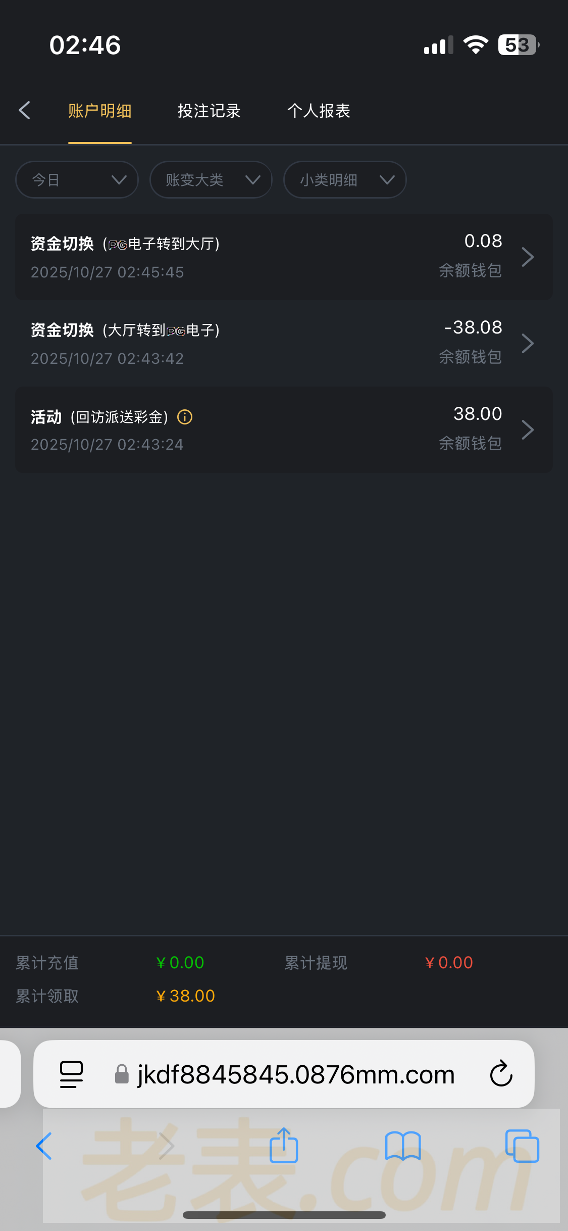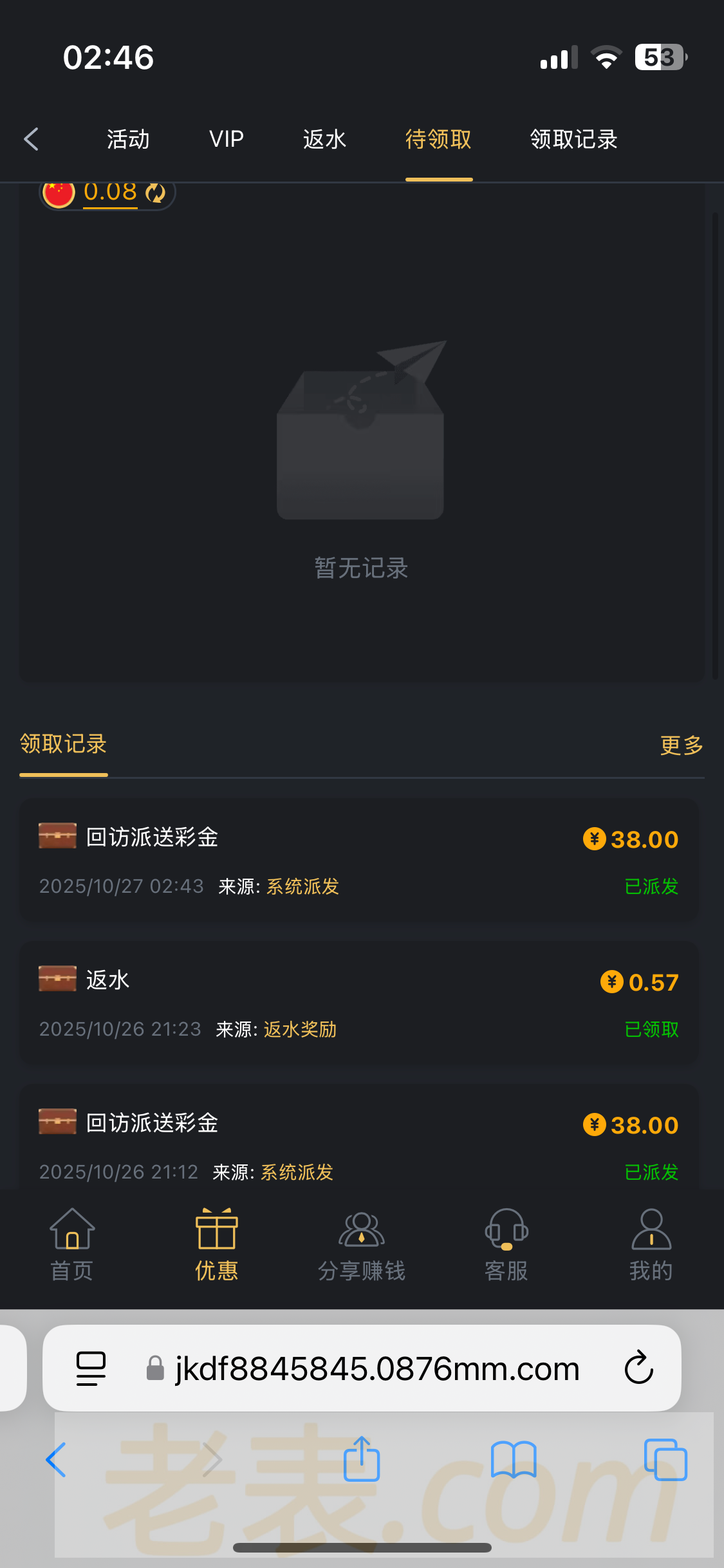 这个台送了两个回访彩金给我,一天一个