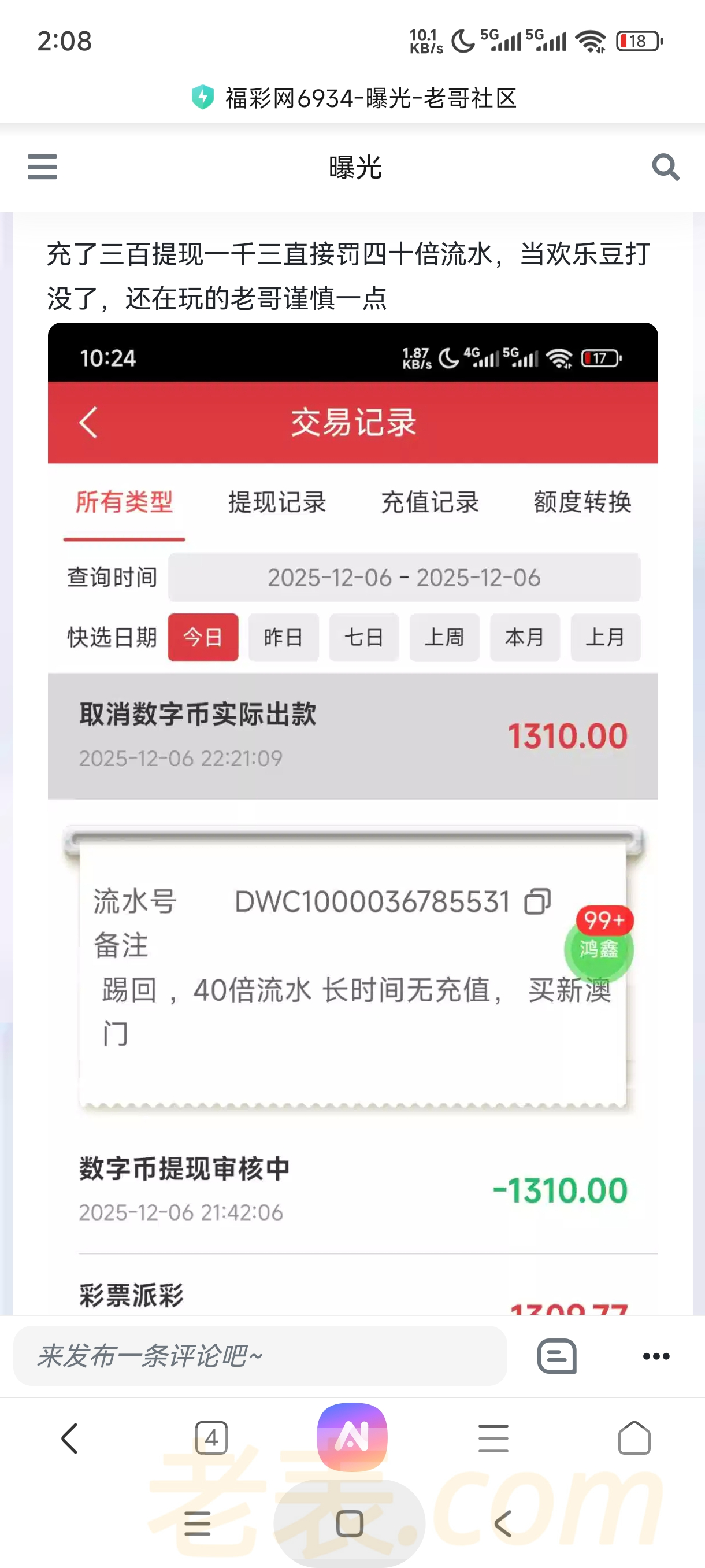 大黑逼台,充值三百提现一千三罚四十倍流水,当欢乐豆打没了