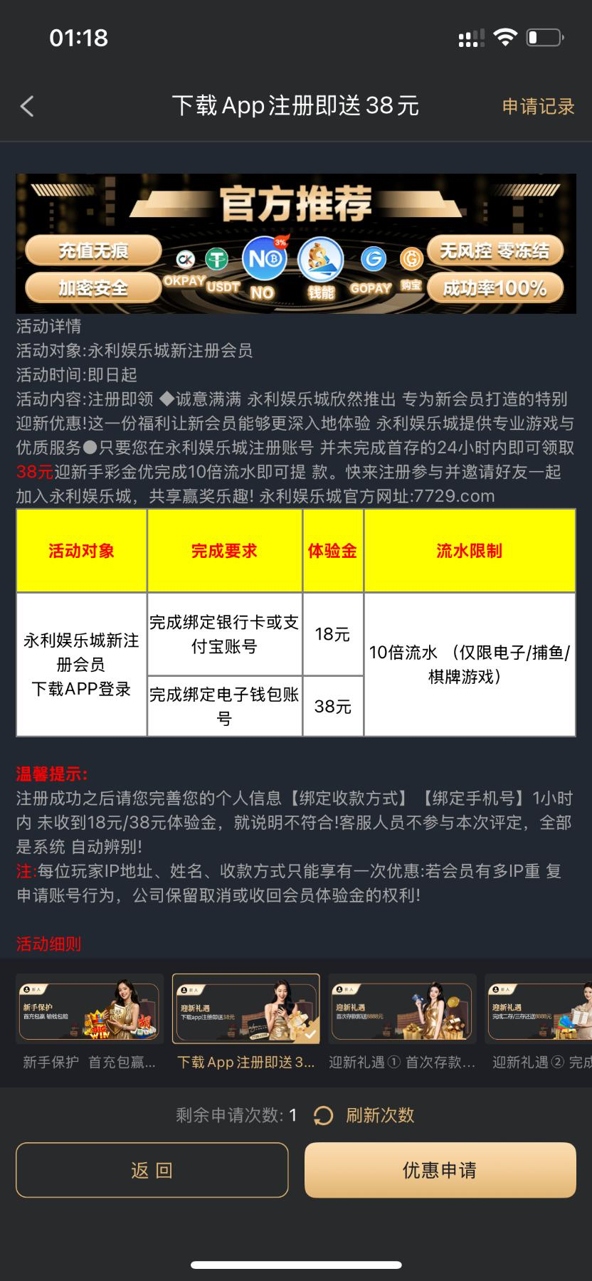 新人注册领18+38。 我是老号没领到。 没号的可以去试一下。我是老号玩过出款没问题