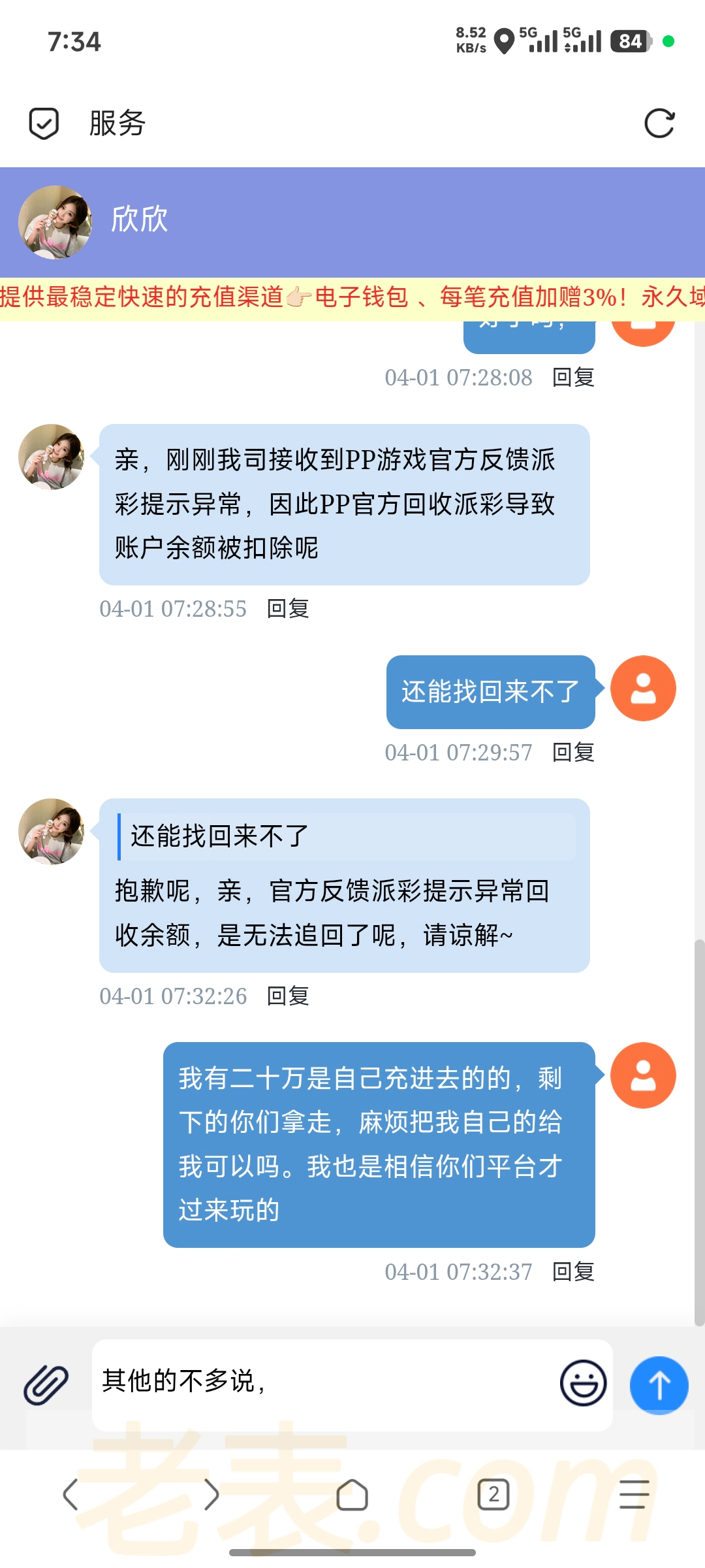而且这个模板的台都不能玩真人,以前的pg.cc 说倍投是无风险投注警告我在玩扣除盈利,上个月我在0870玩evo真人也是警告我后续不能在玩evo 然后半个月前我被197必赢 直接扣除盈利退本